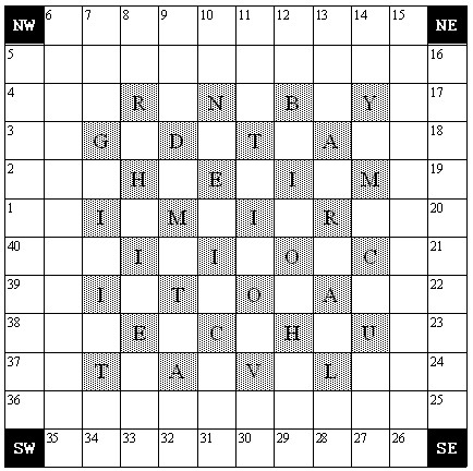 away from the appropriate corner (the SE square for clues 1-10, and so on).