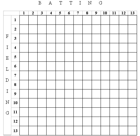 Their 1st XI are shy: after each has emerged and signed on, they hide in bars. From the opening stand to the closing partnership they cross the field, though, as cricket is not their game, the batting order is irregular. Each clue comprises a number of non-overlapping clues in entry order. As every part of the field is covered twice, clued grid entries of one letter have, and those of two letters may have, only one indication. The solver, as Captain, must enter bars, having first arranged the field so that it is symmetrical from both ends, going for length where there is a choice, and regarding runs of fewer than three as singles. To ensure a unique solution, only one clued word survives in the completed diagram.