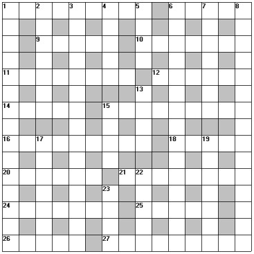 DOWN 1 What begat warmer love at the greengrocer's? (9, 6) 2 Principals in print? (7) 3 What is and what might be (5, 3,7) 4 No bird returns in Worcester (5) 5 One is enough for me, said Newman (4) 6 They have their uses near sundry coves (8, 7) 7 'Is thy ------ a dog, that he should do this great thing?' (7) 8 Interpreted by 26 (3, 8, 4) 13 Seen (indistinctly?) where the crab lurks (4) 15 Sagittarius doesn't hesitate (4) 17 Produces, e.g., boils (7) 19 'What is the --------- of Pythagoras concerning wild-fowl?' (Twelfth Night) (7) 22 Four cards in one (5) 23 Her mother has no other island (4) |