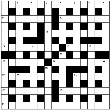 | ACROSS 1 Leftovers unbaked - squabble heatedly (6,3,6) 9 Smile about non-U rug, area rug from Turkey? (7) 10 An instrumental flourish making groupie cheer (7) 11 With one bound, swiftly cross Scottish burn (5) 12 Pharaoh's name recollected by knowing about scripture (9) 13 Most of nautical trips taking time to discover primitive life forms (8) 15 Go downhill - four points to secure gold (6) 18 Former chess champion backed by his country of birth (6) 19 Water lilies boss placed between north wing and south (8) 22 Compact pieces found in afternoon hail (9) 24 Cross seen outside East German city (far to the east) (5) 25 Like to travel by horse, but not sidesaddle (7) 26 Newton at the heart of computing theorist's revolution (7) 27 Threesome's ecstasy threefold, relating kinkily (7,8)