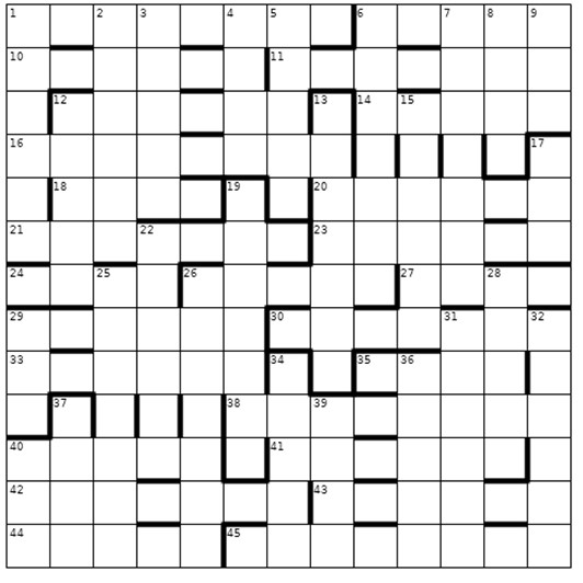 | Across 1 Most flash underwear on command (8) 6 Eyes about to open, finally, welcoming in the morning (5) 10 Open out at regular intervals, but narrowly, along line (6) 11 People in power accepting fake coin for treatment (7) 12 Compound interest’s primary goal when talking about stocks (6) 14 One receiving cash and joint from radio host (5) 16 In retirement, Craft sells possessions in ancient woods? (8) 18 Good boy is civil in language and address (4) 20 Flash of enlightenment provided by analysing ratios (6) 21 Once again, lay sliced fruit between toasted rye (7) 23 Ass burdened by lightest metal in faint morning sunrise (6) 24 Fundamentally, ditzy overdressed lady labelled thus? (4) 26 Presents home of wizard in cave (5) 27 Start conflagration (4) 29 One originally just found in North America, near centre of reservation, at one end of Colorado? (6) 30 After firing seconds, squire set off more peacefully (7) 33 In support, steer revolutionary missile (6) 35 Bright sun to rise, making horizons invisible (4) 38 In Eurasia, produce Top Gear with international following (8) 40 Marble area before entrance (5) 41 One that ruminates on Twitter, following its owner (6) 42 Insect in barrel containing measure of cloth (7) 43 Bird pair with one offspring (6) 44 Arrogant Communists? (5) 45 Sopranist forgetting intro from Prodigy’s “twisted firestarter” (8) |
